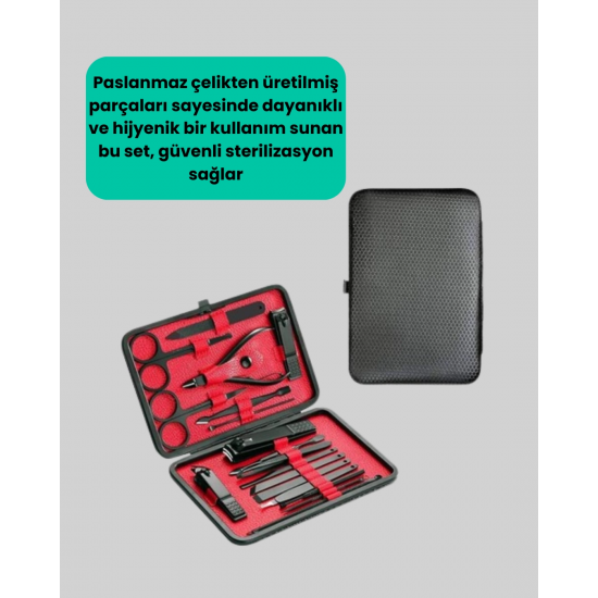 Profesyonel bakım deneyimini evinize taşıyan bu 17 parçalık manikür seti, el ve ayak bakımınızı eksiksiz yapmanız için tasarlanmıştır. Paslanmaz çelikten üretilmiş tüm parçaları, uzun ömürlü kullanım ve hijyenik temizlik imkanı sunar. Korozyona dayanıklı yapısı sayesinde zamanla bozulmaz, keskinliğini korur. Set içerisinde büyük, küçük ve sivri uçlu tırnak makasları, törpü, cımbız, pedikür bıçakları, tırnak kaldırma aparatı ve kulak temizleme aparatı gibi birçok farklı alet bulunur. Yeni nesil siyah kaymaz parlatma teknolojisi sayesinde aletler hem şık bir görünüme sahiptir hem de kolay kavrama sağlar. Şık deri kaplama kutusu, tüm parçaları düzenli şekilde saklamanıza yardımcı olur. Tek tuşla açılabilen bu kutu, hafif ve taşınabilir yapısıyla seyahatlerde de yanınızda taşınabilir. Günlük kullanım için pratik, hediye seçeneği olarak da şık bir alternatiftir.