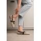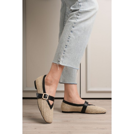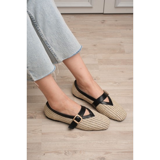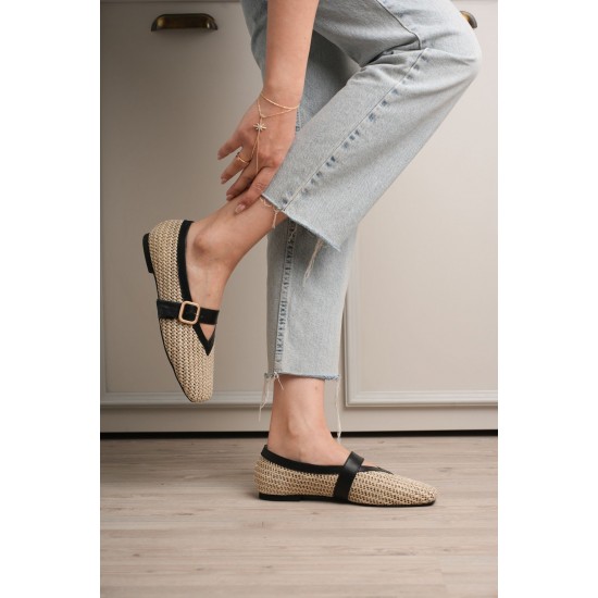 Ponti Siyah Cilt Hasır Detaylı Babet Ayakkabı