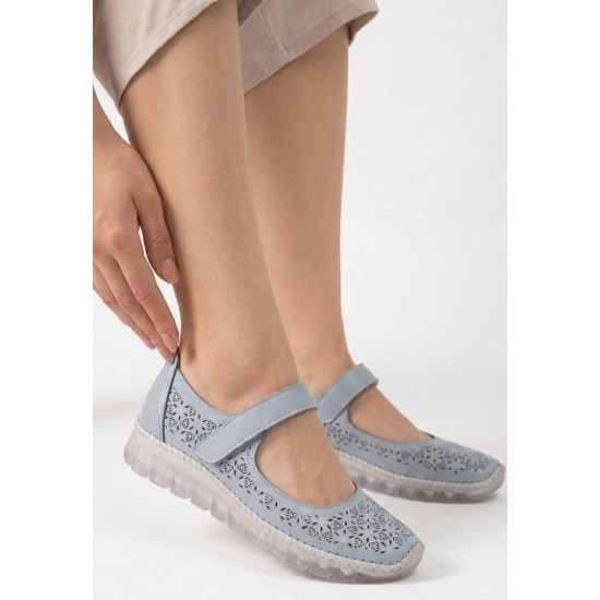 Sina Mavi Deri Cırt Cırtlı Babet Ayakkabı