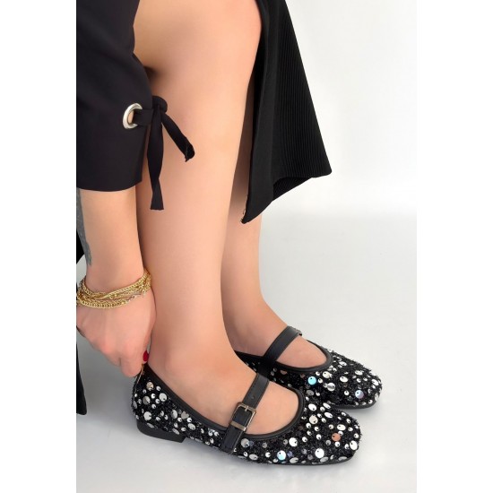 Zaty Siyah Süet Gümüş Pullu Babet Ayakkabı