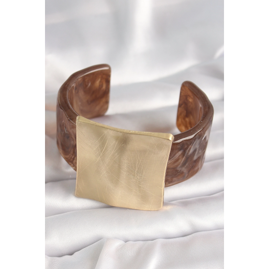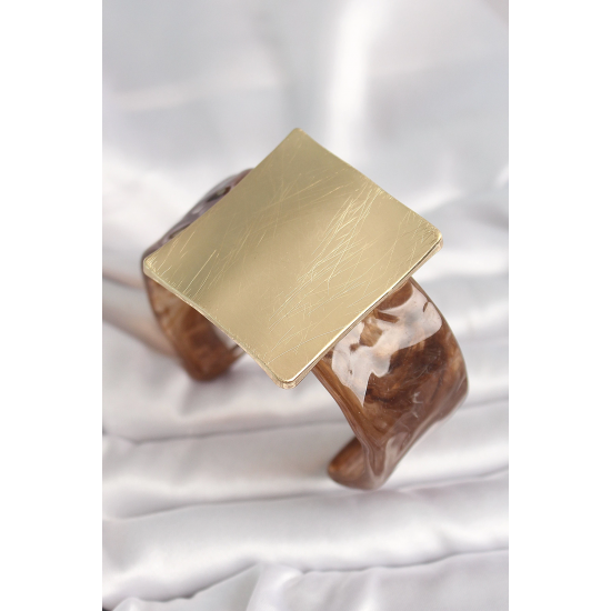 Mey İthalat® Kahverengi Mermer Desen Akrilik Plastik Gold Kare Plaka Model Vintage Kadın Bilezik