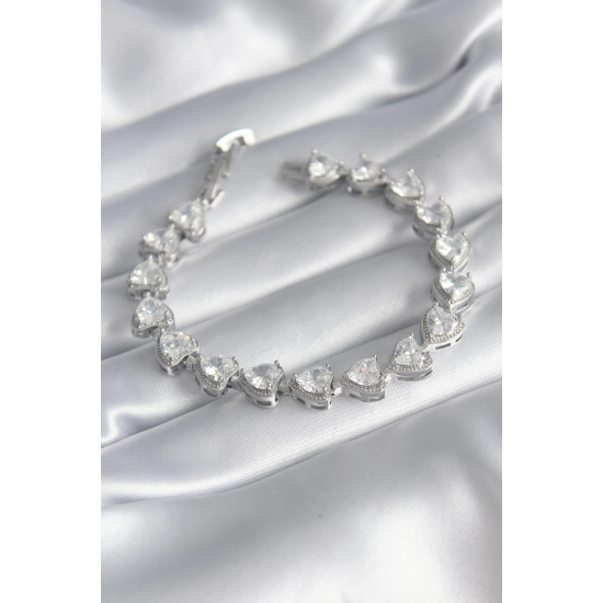 Mey İthalat® Pirinç Gümüş Renk Zirkon Taşlı Kalp Model VIP Seri Kadın Bileklik