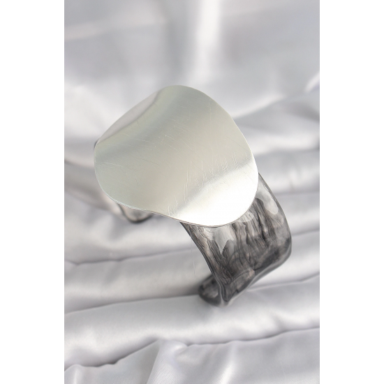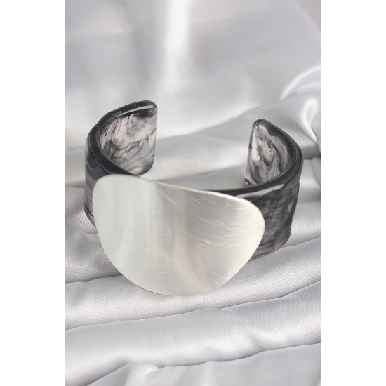 Mey İthalat® Siyah Mermer Desen Akrilik Pilastik Gümüş Plaka Model Vintage Kadın Bilezik