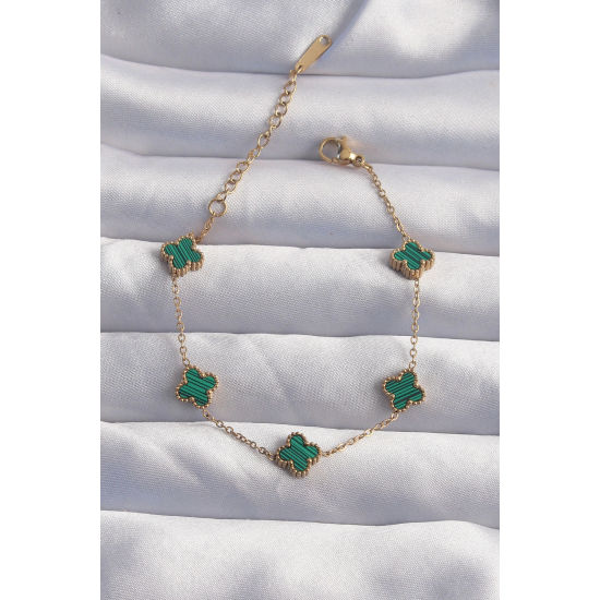 Mey İthalat® 316L Çelik Baby Boy Gold Renk Çizgili Yeşil Mineli Yonca Bileklik