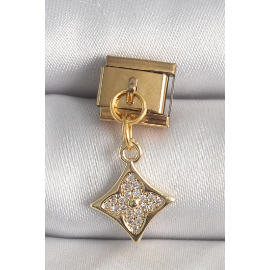 Mey İthalat® 316L Çelik Gold Renk Sallantı Zirkon Taşlı Çiçek İşlemeli Nomination Charm