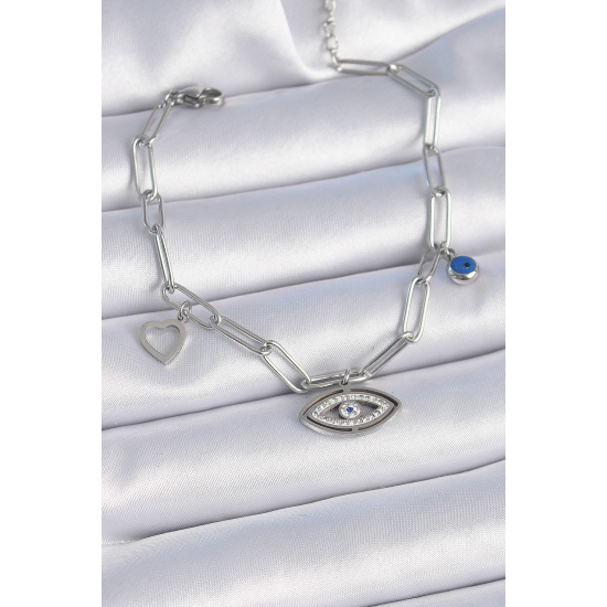 Mey İthalat® 316L Çelik Gümüş Renk Zirkon Taşlı Göz Figür Kalp Detay Kadın Bileklik