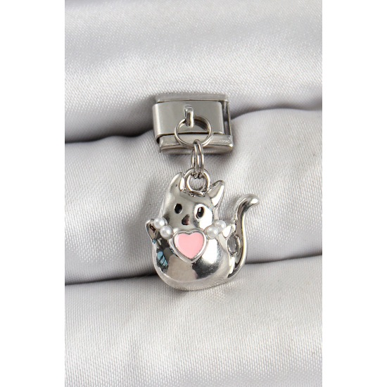 Mey İthalat® 316L Çelik Sallantılı Kalp Detaylı Kedi Model Gümüş Renk Nomination Charm