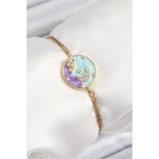 Mey İthalat® 316L Çelik Zincir Mineli Sanatsal Portre Zirkon Taşlı Gezegen Model Gold Renk Kadın Bileklik