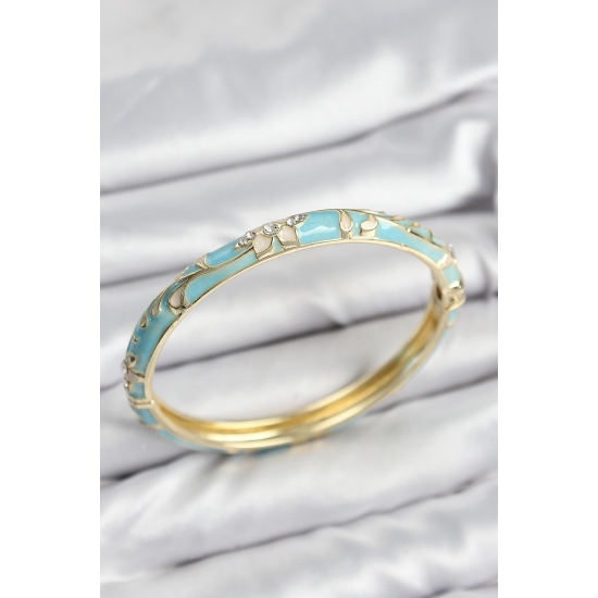 Mey İthalat® Mineli Pirinç Zirkon Taşlı Turkuaz Çiçek Motifli Gold Kadın Kelepçe