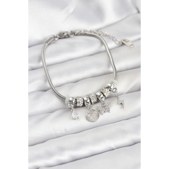 Mey İthalat® Pirinç Gümüş Renk Kelebek Charmlı Kadın Bileklik