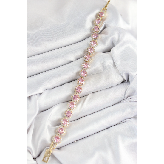 Mey İthalat® Pirinç Pembe Zirkon Taşlı Daire Baget Model Gold Renk VIP Seri Kadın Bileklik