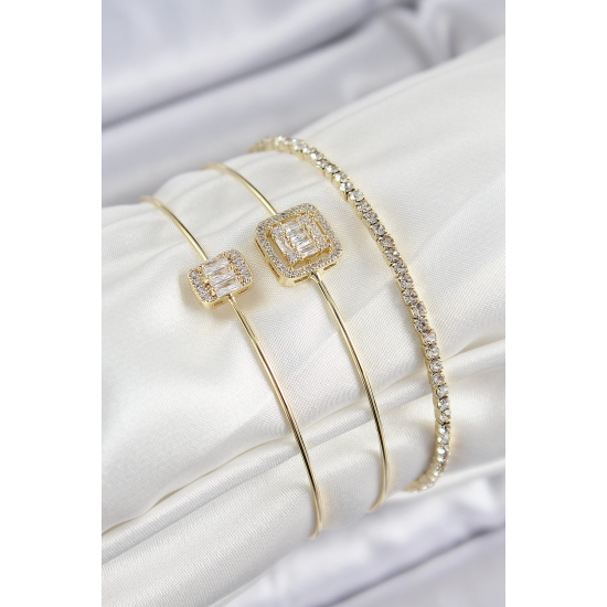 Mey İthalat® Pirinç Zirkon Taşlı Baget Model Gold Renk Vip 3'lü Kadın Bileklik