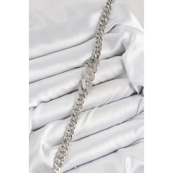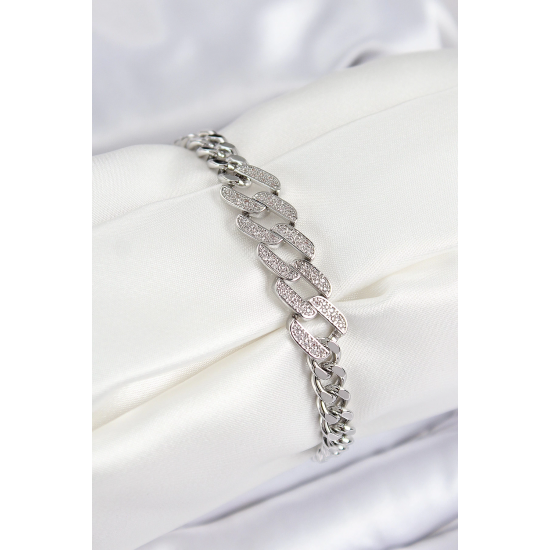 Mey İthalat® Pirinç Zirkon Taşlı Ezme Küba Zincir Model Gümüş Renk Kadın Bileklik