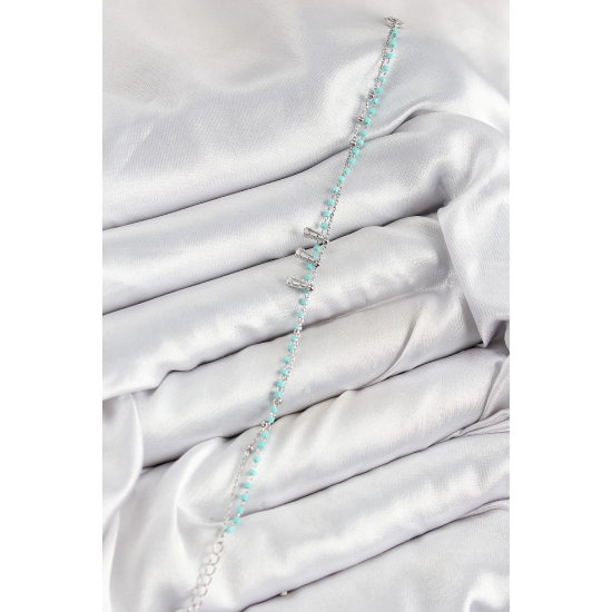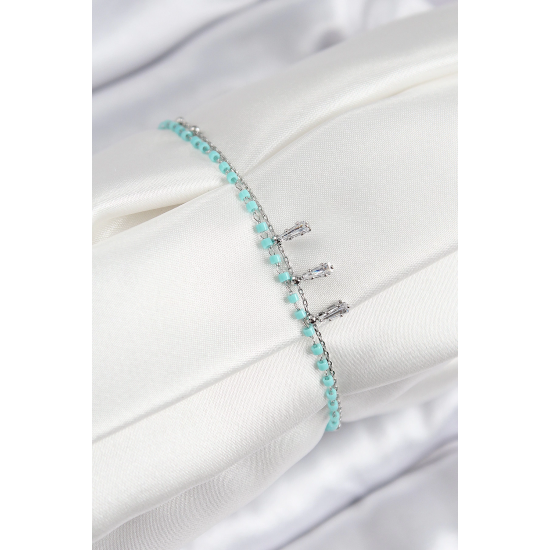 Mey İthalat® Pirinç Zirkon Taşlı Mavi Boncuklu Model Gümüş Renk Kadın Bileklik