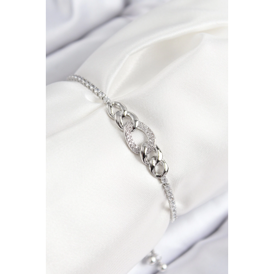 Mey İthalat® Pirinç Zirkon Taşlı Zincir Model Gümüş Renk Asansörlü Kadın Bileklik