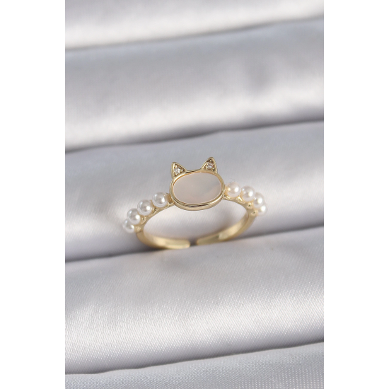 Mey İthalat® Pirinç Gold Renk Ayarlanabilir Beyaz Mineli Kedi Model İnci Detay Kadın Yüzük