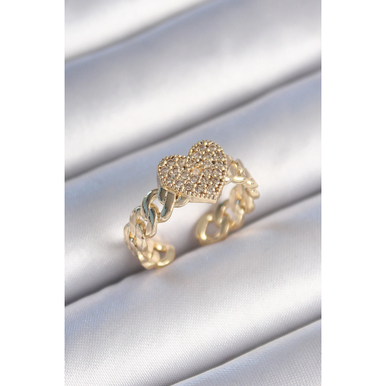 Mey İthalat® Pirinç Gold Renk Zincir Kordon Zirkon Taşlı Kalp Model Kadın Yüzük
