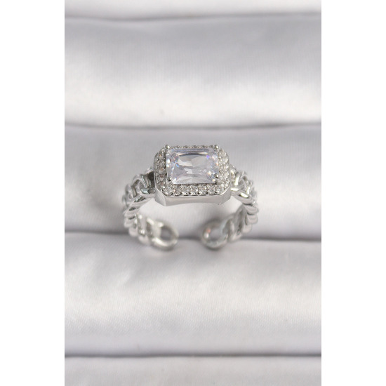 Mey İthalat® Pirinç Gümüş Renk Ayarlanabilir Zincir Kare Zirkon Taşlı Kadın Yüzük