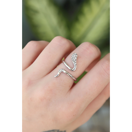 Mey İthalat® Pirinç Gümüş Renk Ayarlanabilir Zirkon Taşlı Yılan Yüzük