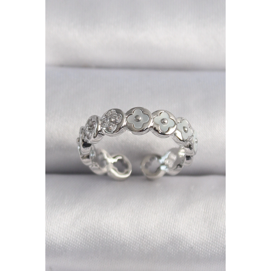 Mey İthalat® Pirinç Gümüş Renk Beyaz Sedefli Yonca Model Kadın Yüzük