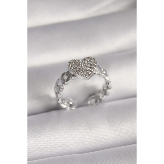 Mey İthalat® Pirinç Gümüş Renk Zirkon Taşlı Kalp Model Kadın Yüzük