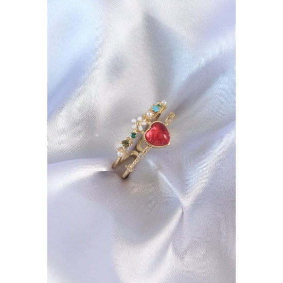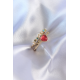 Mey İthalat® Gold Renk Kırmızı Zirkon Taş Kalp Model Pirinç Kadın Yüzük