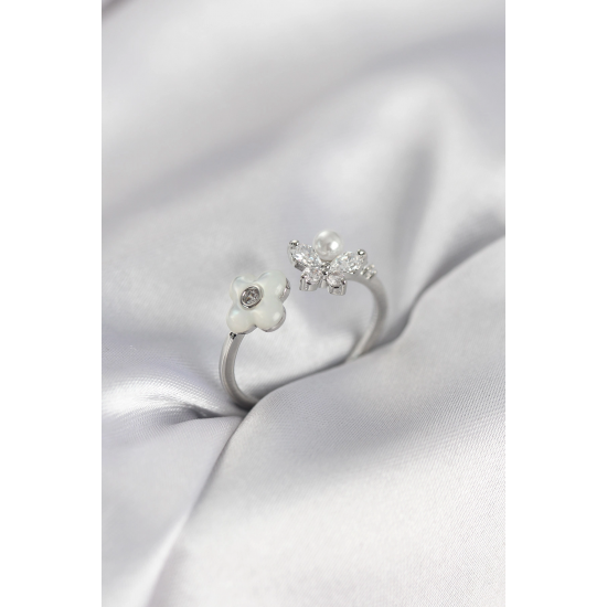 Mey İthalat® Gümüş Renk Sedefli Çiçek Model Kadın Yüzük