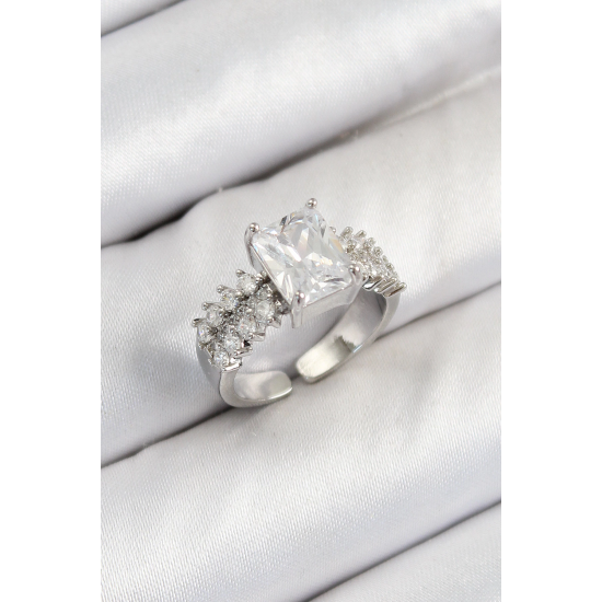 Mey İthalat® Pirinç Büyük Zirkon Taşlı Model Gümüş Renk Kadın Yüzük