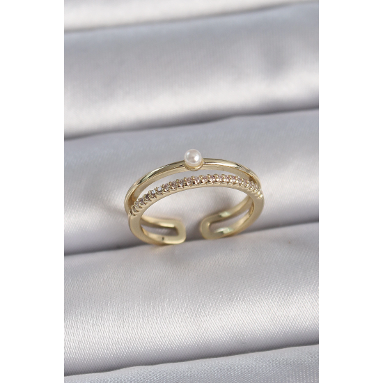 Mey İthalat® Pirinç Gold Renk Zirkon Taşlı İnci Detay Ayarlanabilir Model Kadın Yüzük