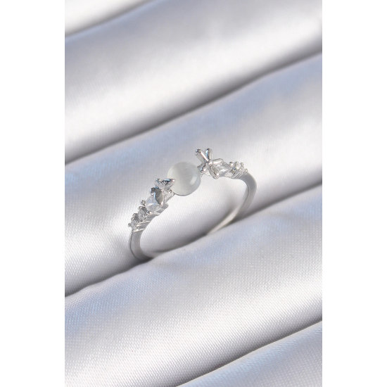 Mey İthalat® Pirinç Gümüş Renk Zirkon Taşlı Beyaz Mineli Kelebek Detay Kadın Yüzük