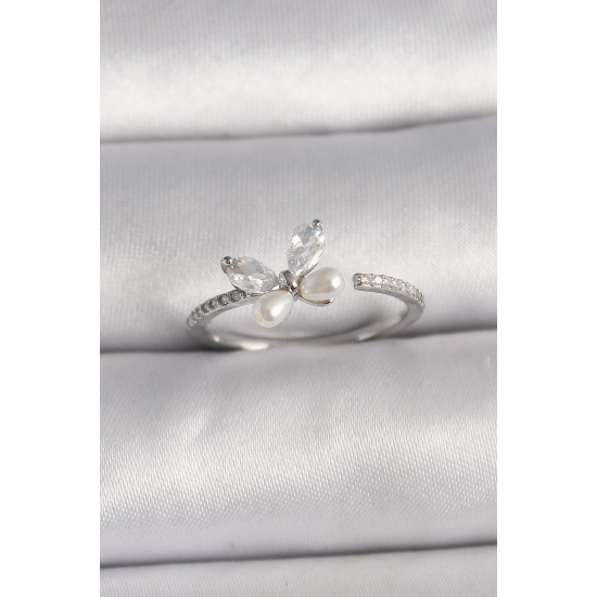 Mey İthalat® Pirinç Gümüş Renk Zirkon Taşlı Kelebek Model İnci Detaylı Ayarlanabilir Yüzük