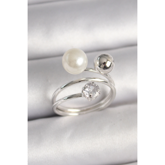 Mey İthalat® Pirinç Gümüş Renk Zirkon Taşlı Toplu İnci Model Kadın Yüzük