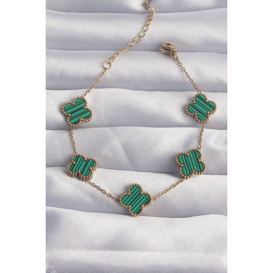 Mey İthalat® 316L Çelik Gold Renk Çizgili Yeşil Mineli Yonca Bileklik