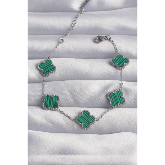 Mey İthalat® 316L Çelik Gümüş Renk Çizgili Yeşil Mineli Yonca Bileklik