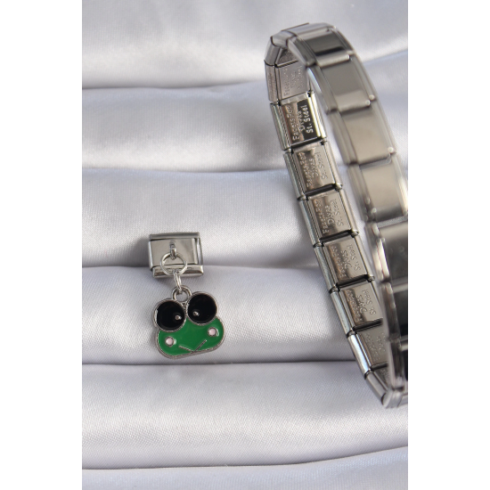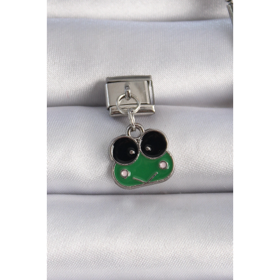 Mey İthalat® 316L Çelik Gümüş Renk Sallantılı Yeşil Kurbağa Figür Nomination Charm
