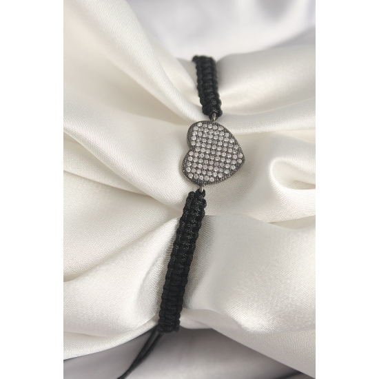 Mey İthalat® Pirinç Füme Renk Zirkon Taşlı Kalp Figür Asansörlü Makrome Model Kadın Bileklik
