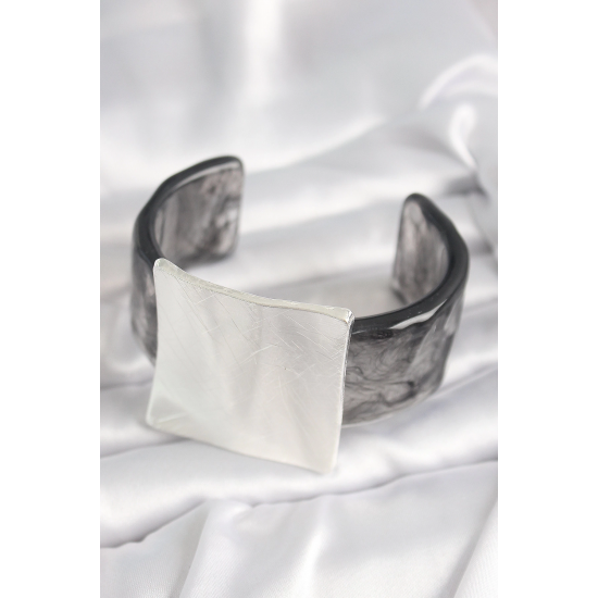 Mey İthalat® Siyah Mermer Desen Akrilik Plastik Gümüş Kare Plaka Model Vintage Kadın Bilezik