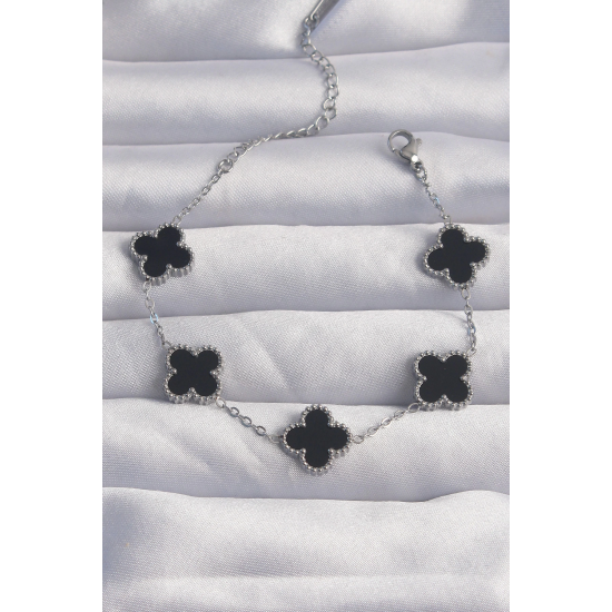 Mey İthalat® 316L Çelik Gümüş Renk Siyah Mineli Yonca Bileklik
