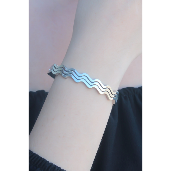Mey İthalat® 316L Kararmaz Çelik Gümüş Renk Dalga Model Kelepçe Kadın Bileklik
