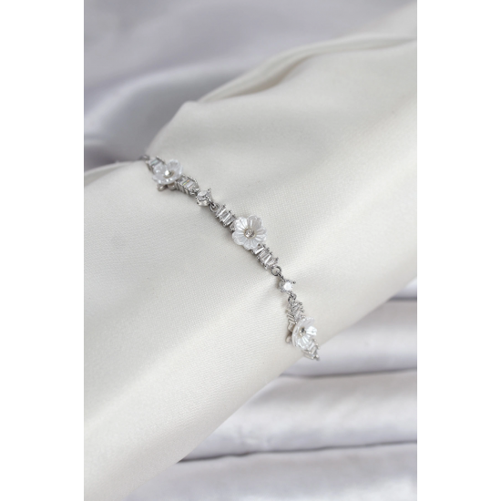 Mey İthalat® Baget Zirkon Taşlı Çiçek Model Gümüş Renk Asansörlü Kadın Bileklik