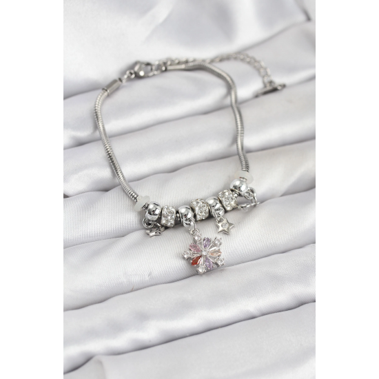 Mey İthalat® Pirinç Gümüş Renk Renkli Yıldız Charmlı Kadın Bileklik