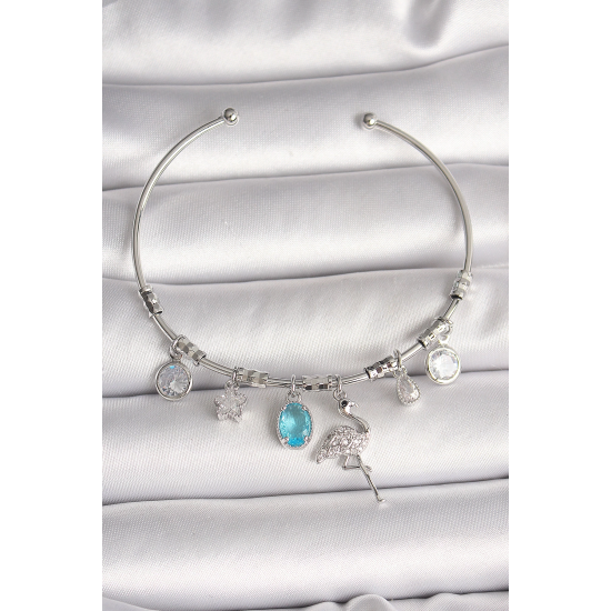 Mey İthalat® Pirinç Gümüş Renk Sallantı Zirkon Taşlı Filaminga Figür Charm Kadın Bileklik