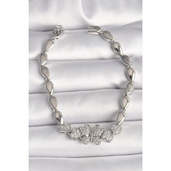 Mey İthalat® Pirinç Gümüş Renk Zirkon Taşlı Kelebek Figür Damla Zincir Model Kadın Bileklik