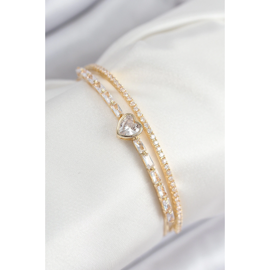 Mey İthalat® Pirinç Zirkon Taşlı Kalp Model Gold Renk Kadın Bileklik