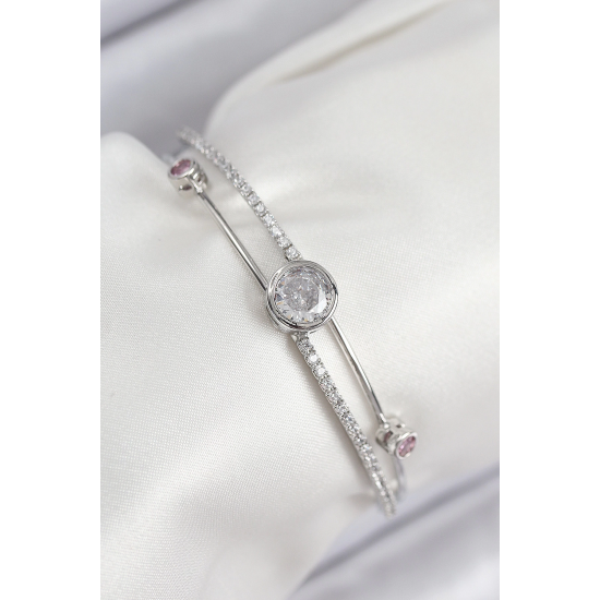 Mey İthalat® Pirinç Zirkon Taşlı Pırlanta Model Gümüş Renk Kadın Bileklik