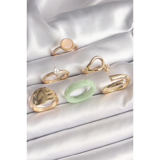 Mey İthalat® Pirinç Gold Renk Zirkon Taşlı Daire Pembe Mineli Detay 6'Lı Kadın Yüzük Seti