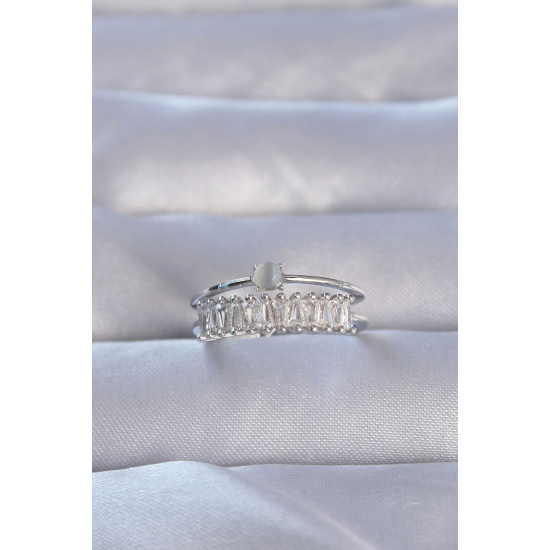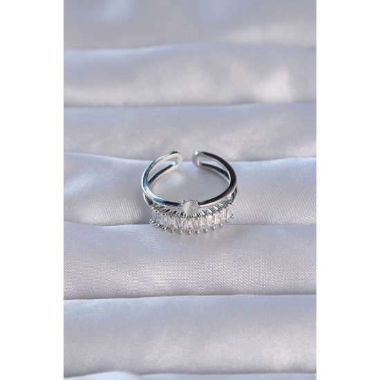 Mey İthalat® Pirinç Gümüş Renk Zirkon Taşlı Baget Su Yolu Model Ayarlanabilir Yüzük