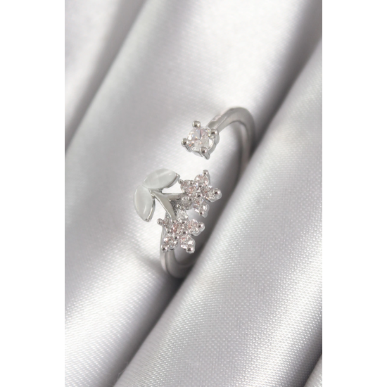 Mey İthalat® Pirinç Gümüş Renk Zirkon Taşlı Çiçek Model Kadın Yüzük