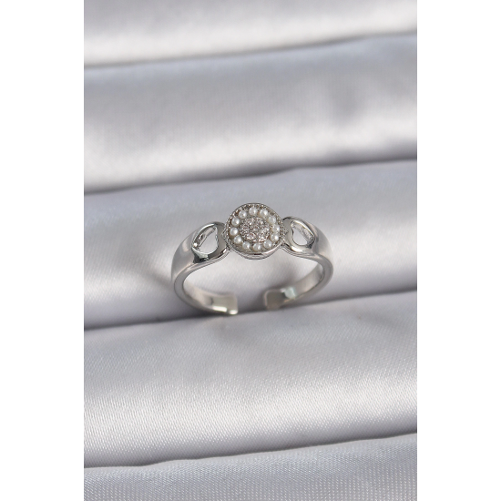 Mey İthalat® Pirinç Gümüş Renk Zirkon Taşlı İncili Kalp İşleme Detay Ayarlanabilir Model Kadın Yüzük