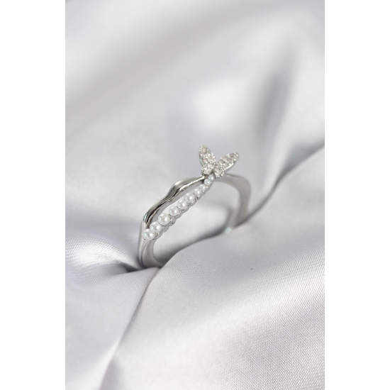 Mey İthalat® Gümüş Renk Kuyruklu Kelebek Model İncili Kadın Yüzük